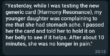 ![]() | "Yesteday, while I was testing the new generic card (Harmony Resonance), my younger daughter was complaining to me that she had stomach ache. I passed her the card and told her to hold it on her belly to see if it helps. After about 10 minutes, she was no longer in pain." |