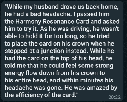 "While my husband drove us back home, he had a bad headache. I passed him the Harmony Resonance Card and asked him to try it. As he was driving, he wasn't able ot hold it for too long, so he tried to place the card on his crown when he stopped at a junction instead. While he had the card on top of his head, he told me that he could feel some strong energy flow down from his crown to his entire head, and within minutes his headache was gone. He was amazed by the efficiency of the card." | ![]() |