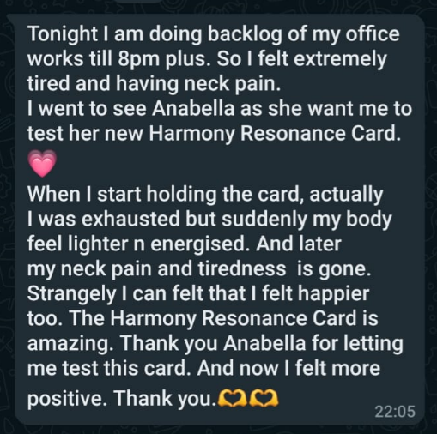 ![]() | "Tonight I am doing backlog of my office work till 8pm plus. So I felt extremely tired and having neck pain. I went to see Anabella as she want me to test her new Harmony Resonance Card. ❤ When I start holding the card, actually I was exhausted but suddenly my body feel lighter n energised. And later my neck pain and tiredness is gone. Strangely I can feel that I felt happier too. The Harmony Resonance Card is amazing. Thank you Anabella for letting me test this card. And now I felt more positive. Thank you." |