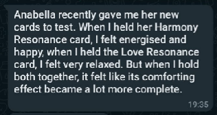 "Anabella recently gave me her new cards to test. When I held her Harmony Resonance card, I feel energised and happy, when I held the Love Resonance card, I felt very relaxed. But when I hold both together, it felt like its comforting effect became a lot more complete." |